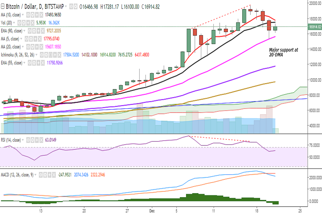 BTC/USD found support at 20-DMA on Wednesday which halted its downtrend. It is currently trading at 16800 levels at the time of writing (Bitstamp).
