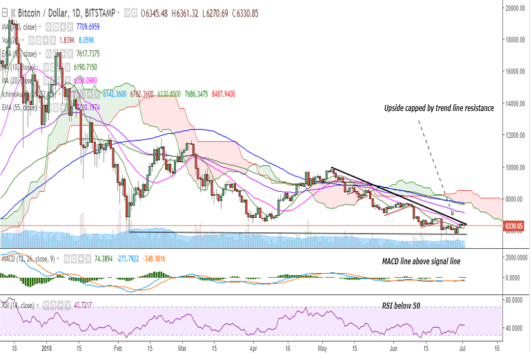 The pair is currently hovering around 20-DMA and a consistent break above 6384 (trend line joining 9948.98 and 6510) would target 6556 (3h 200-SMA)/6798 (4h 200-SMA). Further strength would see it testing 7000/7148 (50-DMA).