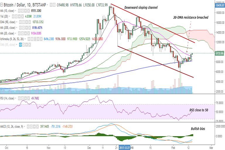 BTC/USD successfully closed above 20-DMA on Wednesday and is currently trading at 9734 levels at the time of writing (Bitstamp).