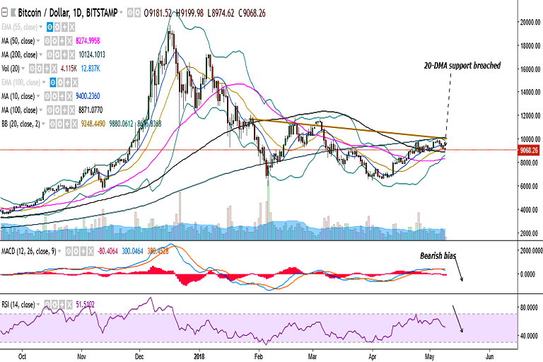 BTC/USD has broken below 20-DMA and is trading at 9082 levels at the time of writing (Bitstamp).