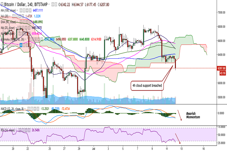 BTC/USD is trading lower on Thursday as it broke below 4h cloud support. It is currently trading at 6192 levels at the time of writing (Bitstamp).