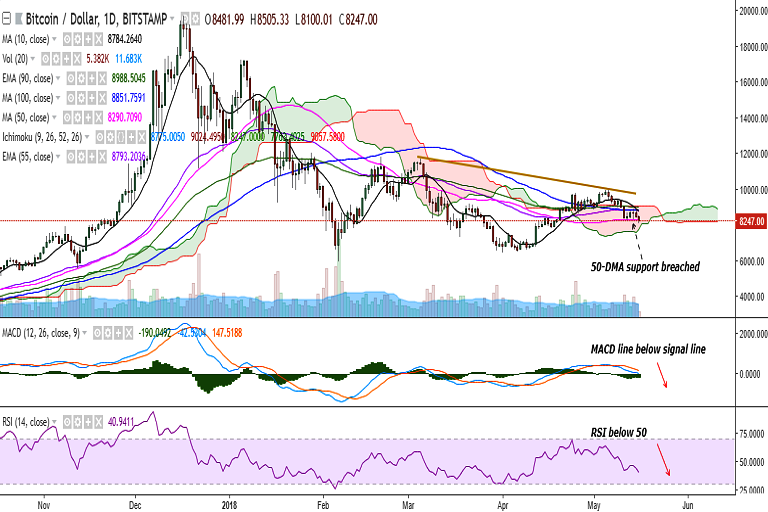 BTC/USD has broken below 50-DMA support and is currently trading at 8244 levels at the time of writing (Bitstamp).