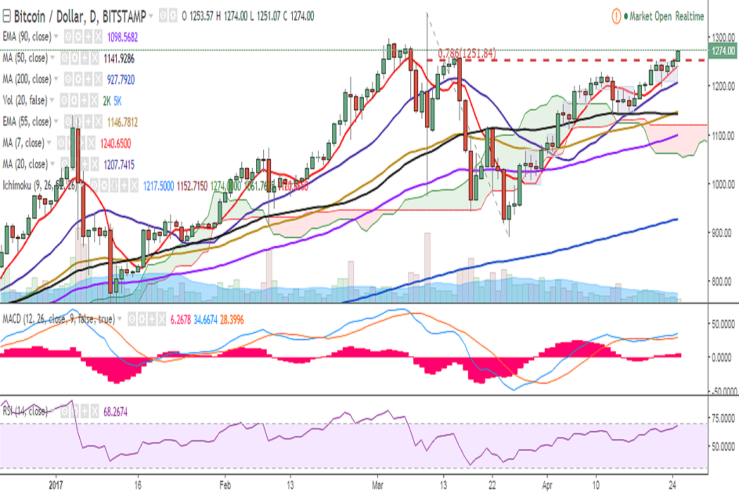 BTC/USD has broken above 1251.84 (78.6% retracement of 1350 and 891.33) on Tuesday and is holding successfully above this level. It is currently trading at 1269 levels at the time of writing (Bitstamp).