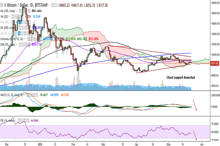 BTC/USD is trading tad lower on Tuesday as it couldn’t hold cloud support. It is currently trading at 8323 levels at the time of writing (Bitstamp).