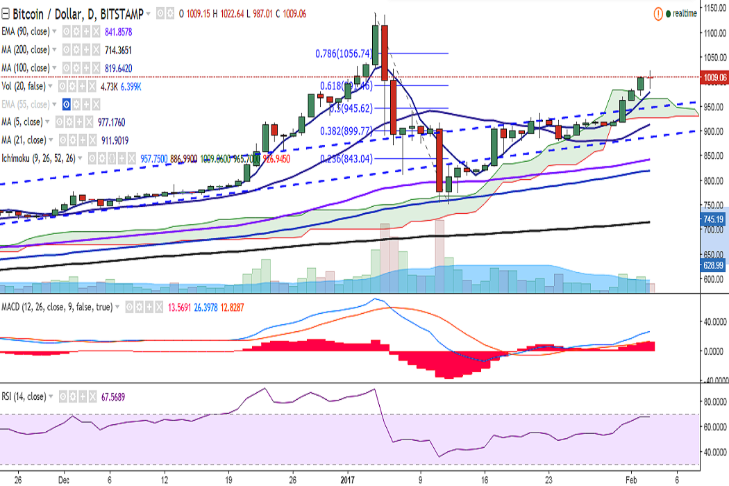 BTC/USD continued its uptrend on Friday and has hit a high of 1022 levels so far in the day. It is currently trading at 1010 levels at press time (Bitstamp).