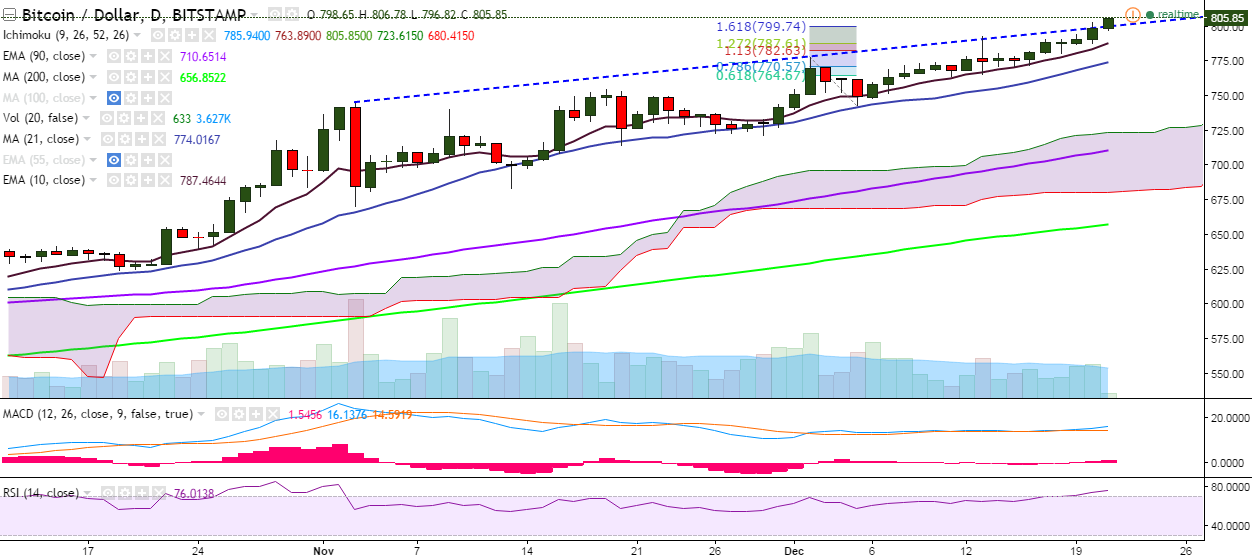 On the reverse side, the pair is likely to find support at 783.37 (10-EMA) and a break below would drag it to 770.97 (21-day MA)/743 (December 05 low).