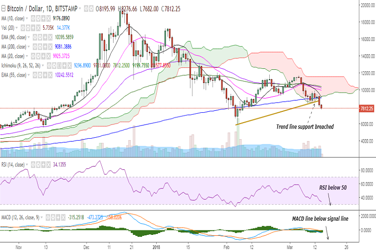 BTC/USD is trading lower on Thursday as it broke below the trend line joining 5920.72 and 8366. It is currently trading at 7835 levels at the time of writing (Bitstamp).