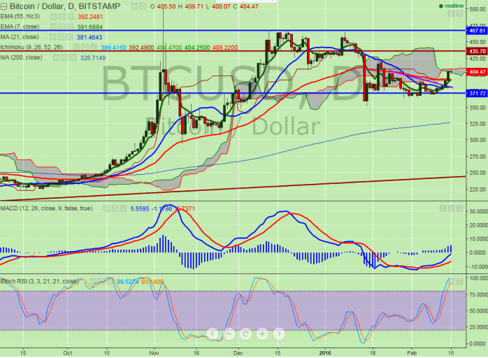 BTC/USD breaks major resistance $402 and jumped till $409. It is currently trading around $404. Short term trend is slightly bullish as long as support $380 holds.