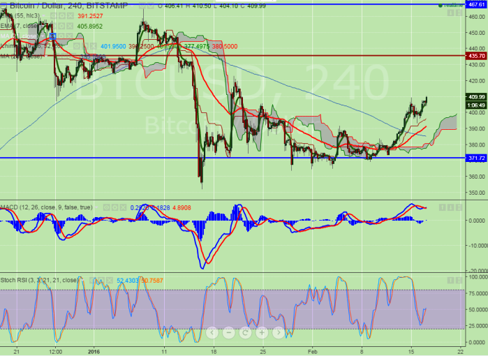 BTC/USD has broken major resistance $409 and jumped till $410.50 at the time of writing It is currently trading around $409.93. Short term trend is slightly bullish as long as support $390 holds.
