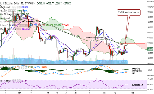 BTC/USD is consolidating in a narrow range after it broke above 21-EMA on August 24.
