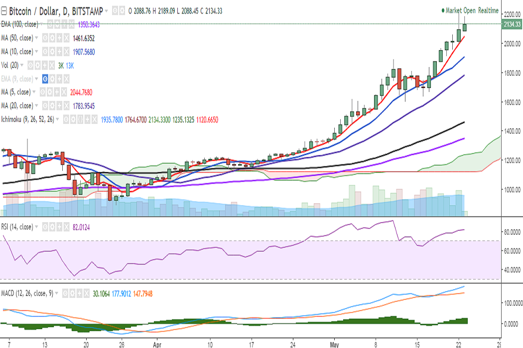 BTC/USD surpassed our target of 2200 levels and hit a fresh all-time high at 2230.34 levels on Monday. However, it could not sustain and closed at 2099.97 levels. It is currently trading at 2140 levels at the time of writing (Bitstamp).