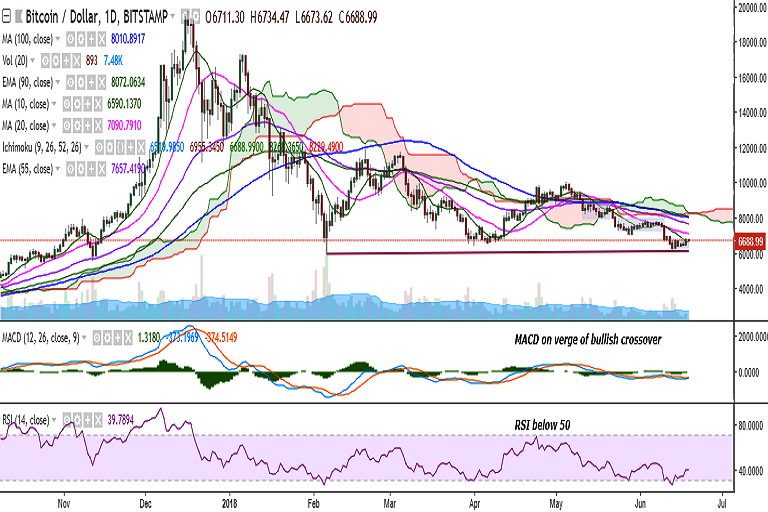 BTC/USD is rangebound on Tuesday after it closed above 10-DMA at 6707 levels. It is currently trading at 6680 levels at the time of writing (Bitstamp).
