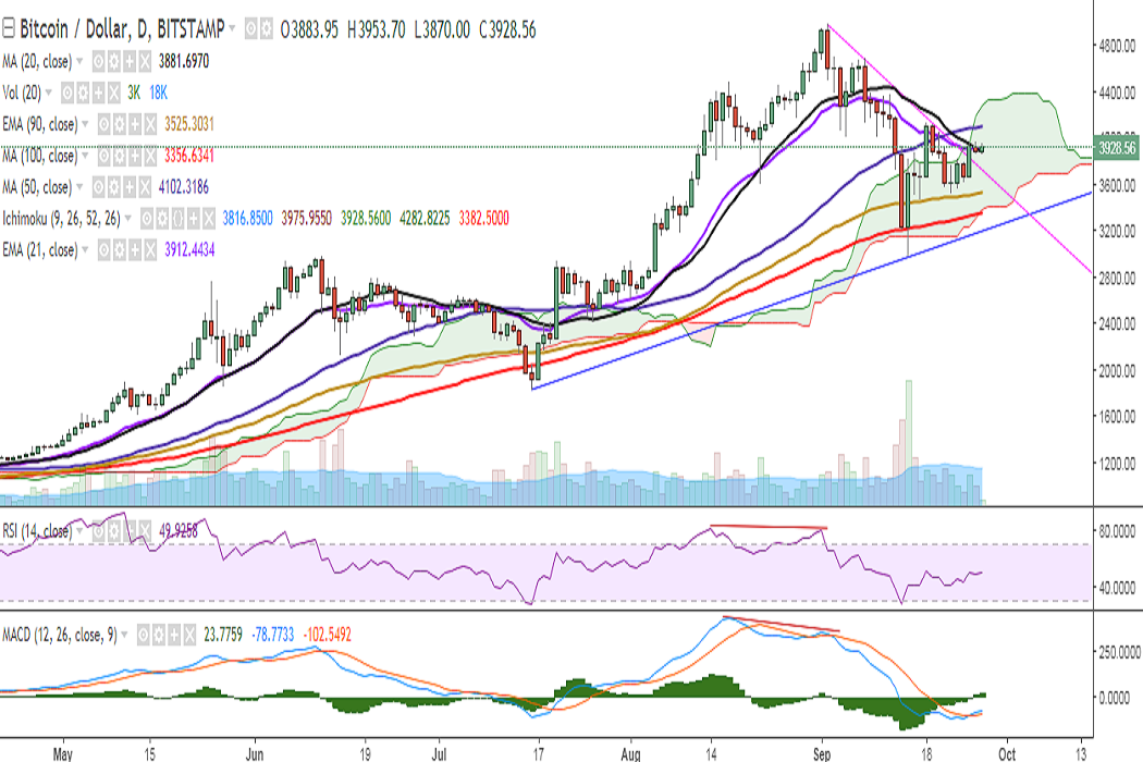 BTC/USD continues to trade in a close range on Wednesday as it is consolidating inside the Ichimoku Cloud. It is currently trading at 3937 levels at the time of writing (Bitstamp).