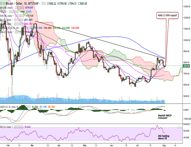 On the downside, the pair is currently holding 21-EMA support at 7578 and a break below is likely to find next support at 7470 (90-EMA). Further weakness would drag it to 7308 (55-EMA)/7182 (Cloud top)/7101 (4h 200-SMA).