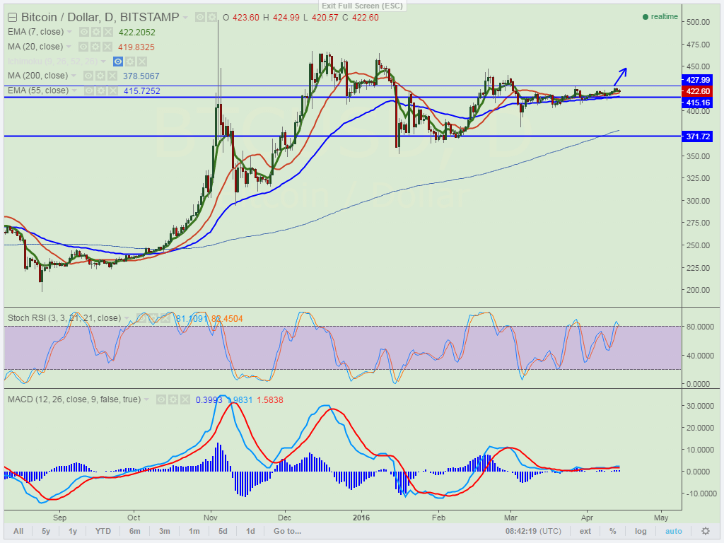 - BTC/USD has slightly retreated till $420.57 at the time of writing after making a high of $426.67. It is currently trading around $422.