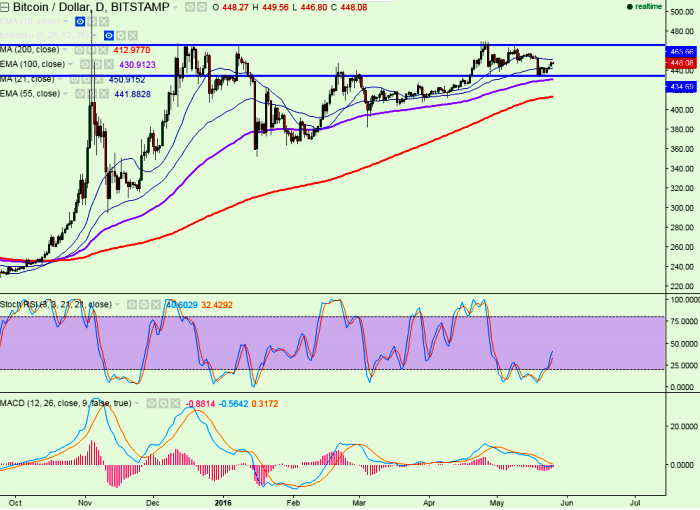 - BTC/USD has made a high of $449.60 yesterday and slightly retreated from that level. . It is currently trading around $447.93.
