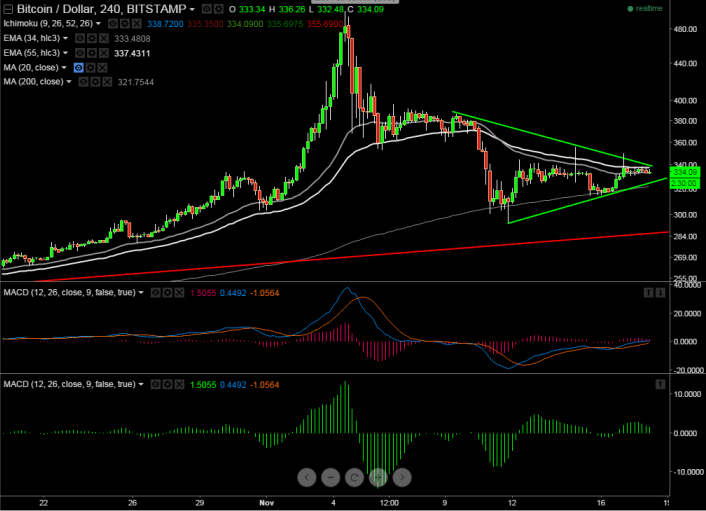 - BTC/USD is trading between $356 and $325 for the past two trading session. It is currently trading around $333. Short term trend is still bearish as long as resistance $370 holds.