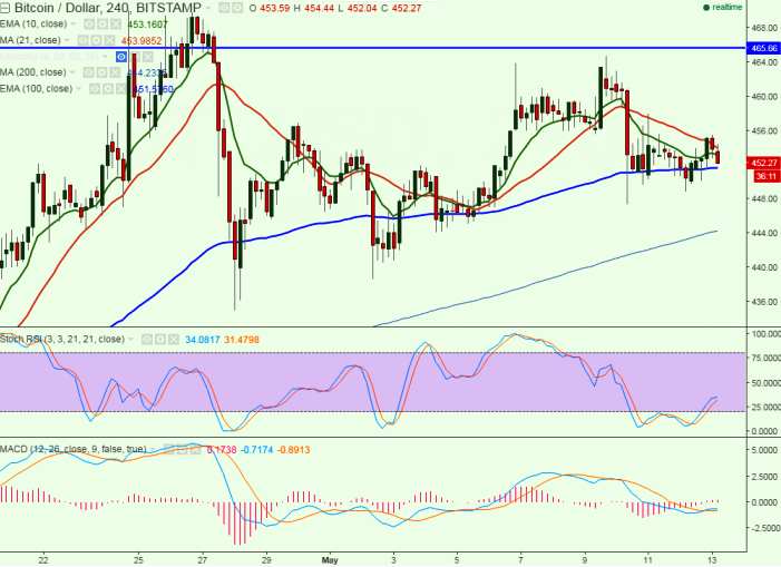 - BTC/USD has once declined till $452 at the time of writing after making a high of $455.55 today. It is currently trading around $452.27.