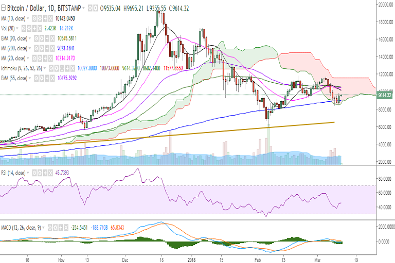 BTC/USD is consolidating inside the cloud on Monday and is trading at 9631 levels at the time of writing (Bitstamp).
