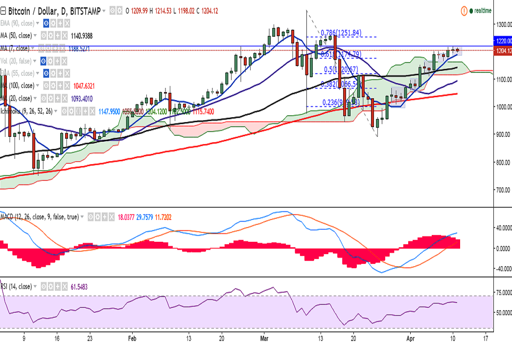BTC/USD is continuing its rangebound trading on Tuesday between 1198 and 1215 levels. It is currently trading at 1208 levels at the time of writing (Bitstamp).