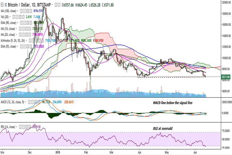 On the downside, the pair stopped short of April 1 low at 6427 levels. A break below this level would weaken the pair further to 6232 (127.2% extension of 9948.98 and 7026.90)/ 5920. Further downward movement would see it testing 5555 (November 12 2017 low).