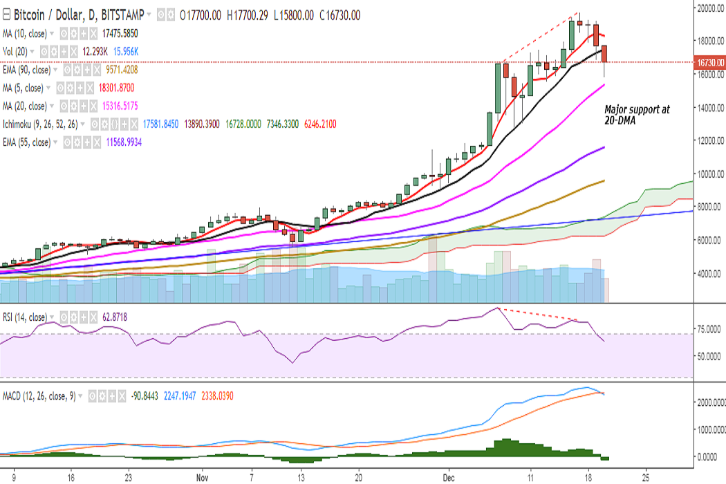 On the reverse side, the pair has found support near 15726 (23.6% retracement of 2972.01 and 19666) and any violation would see it testing 15312 (20-DMA)/14275 (38.2% retracement of 5555.55 and 19666). Further weakness would drag the pair to 14143 (1w 7-SMA)/13815 (3h 200-SMA)/13288.