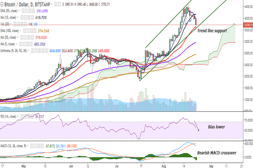 BTC/USD continued its downtrend on Tuesday and fell to 3600 levels. It is currently trading at 3821 levels at the time of writing (Bitstamp).