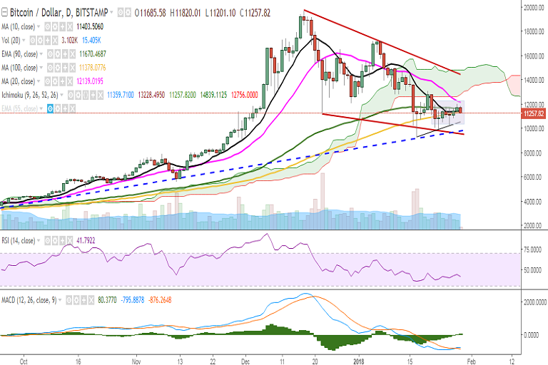 BTC/USD continues trading in a close range on Monday as it is struggling for a close above 90-EMA. It is currently trading at 11303 levels at the time of writing (Bitstamp).