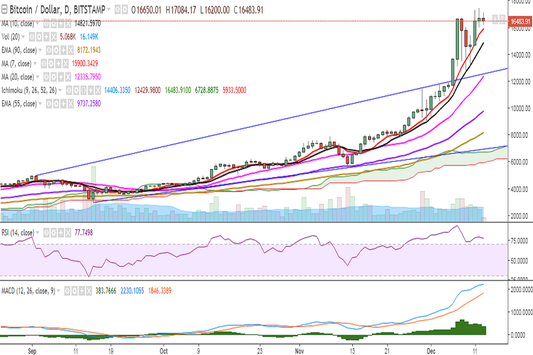 BTC/USD hit a fresh all-time high at 17428 levels on December 12 before it closed at 16650 levels. It is currently trading at 16498 levels at the time of writing (Bitstamp).