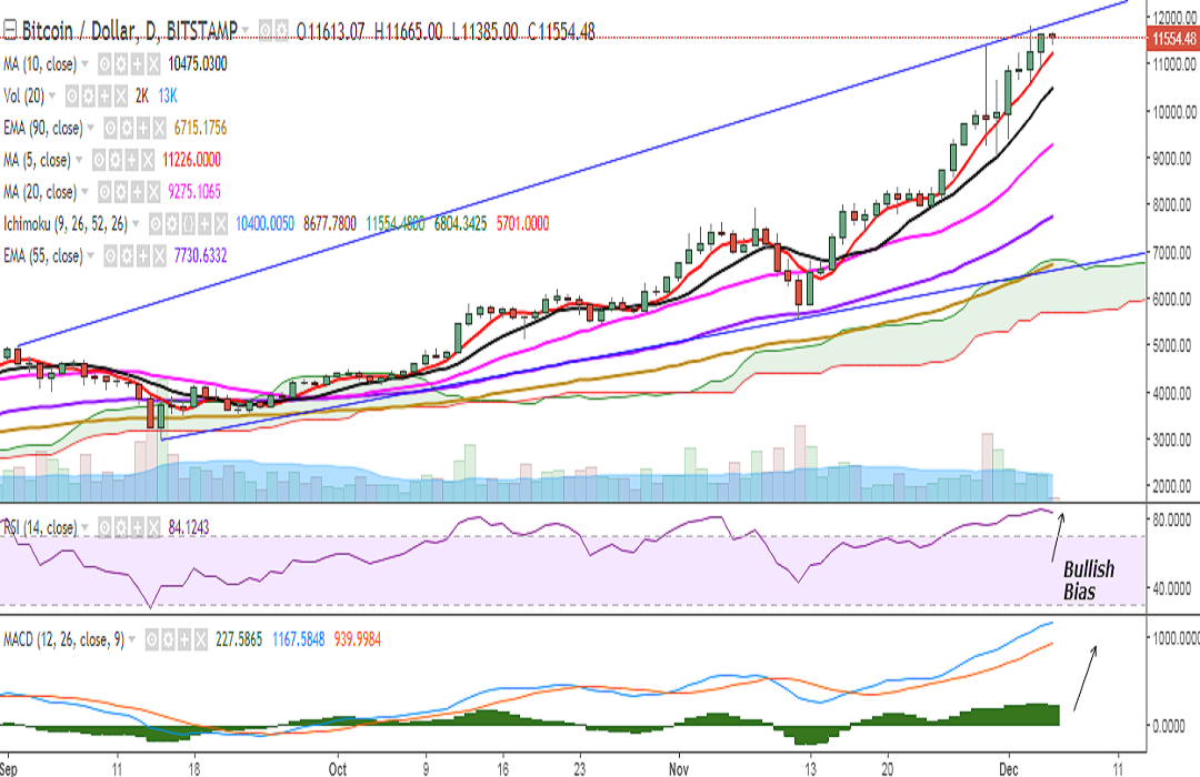BTC/USD is consolidating in narrow range as it faces strong trend line resistance at 11828. It is currently trading at 11524 levels at the time of writing (Bitstamp).