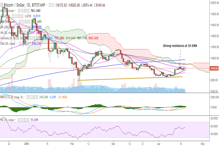 BTC/USD continues to consolidate in a narrow range on Thursday as it struggles for a consistent break above 55-EMA. It is currently trading at 8153 levels at the time of writing (Bitstamp).
