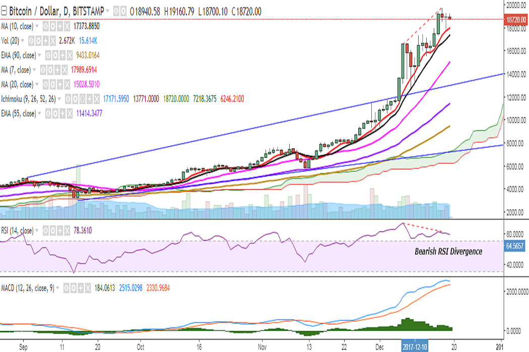 The pair has been looking for a close above 19000 levels in the past couple of sessions. A decisive break above would target 19117 (161.8% retracement of 16666.66 and 12701.05)/19666 (December 17 high). Further strength would see the pair testing 19817 (200% extension of 2972.01 and 11395)/20000/20391 (127.2% extension of 2972.01 and 16666.66)/20632.