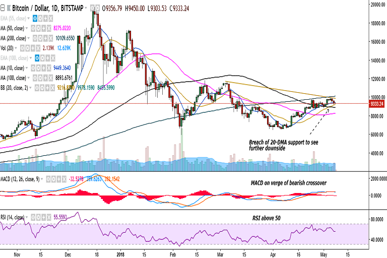 BTC/USD is trading in a close range on Tuesday as it tries to hold above 20-DMA. It is currently trading at 9327 levels at the time of writing (Bitstamp).