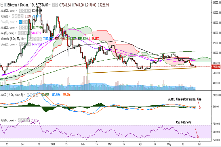 BTC/USD is trading lower on Monday and is trying to hold above 7200 levels at the time of writing (Bitstamp).
