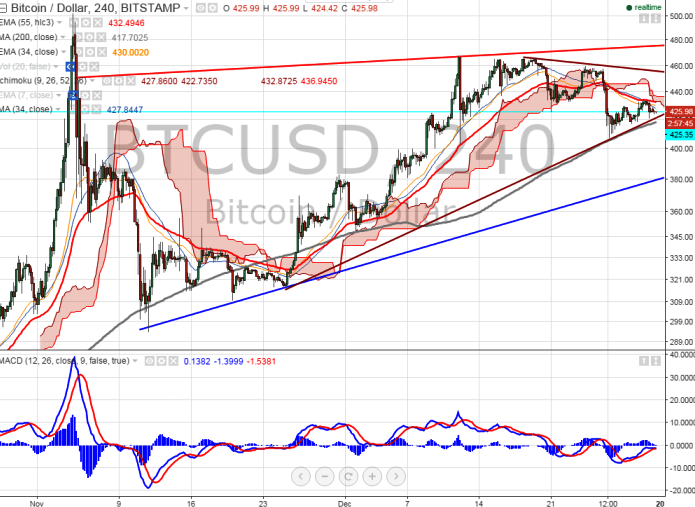 BTC/USD slightly declined till $420 after making a high of $434.97 yesterday is currently trading around $425.