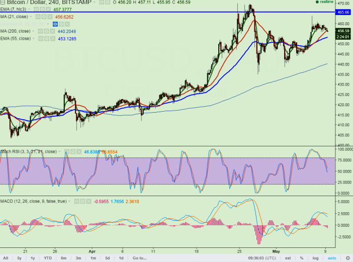 - BTC/USD has retreated after making a high of $463.97.It is currently trading around $457.