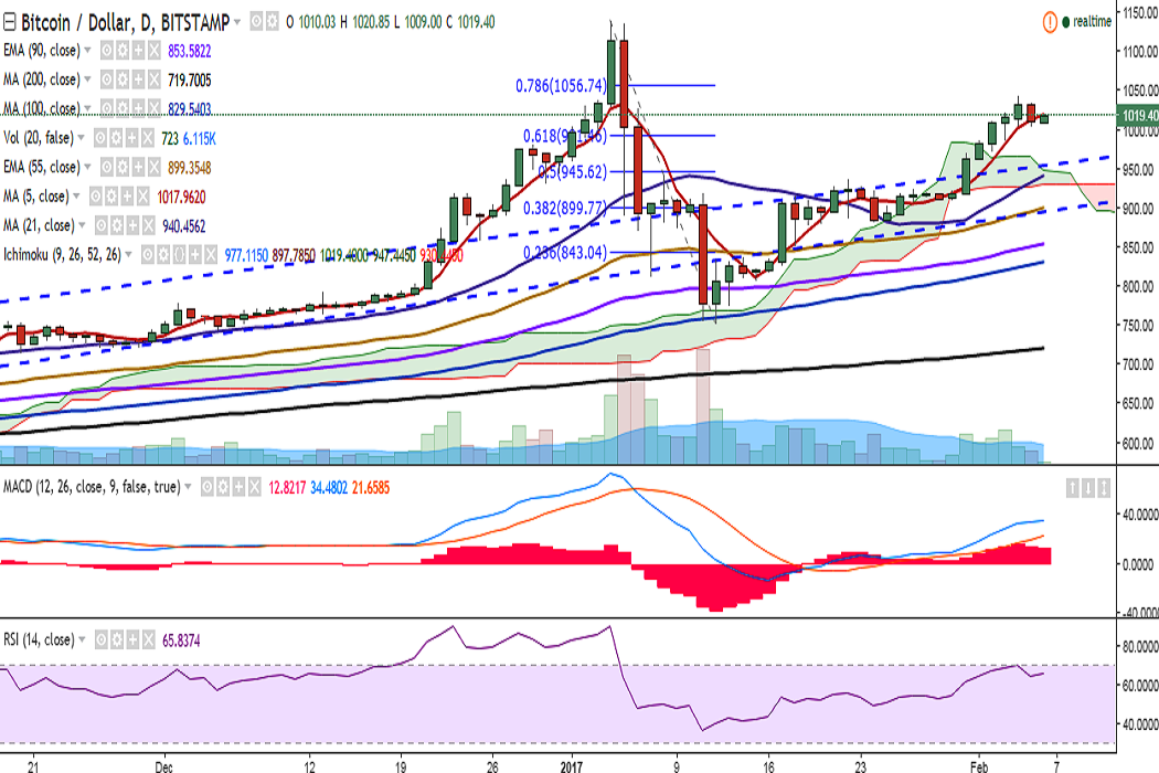 BTC/USD hit a high of 1044 levels on February 04 but failed to hold its strength. The pair is currently hovering around 5-DMA and is trading at 1013 levels at press time (Bitstamp).