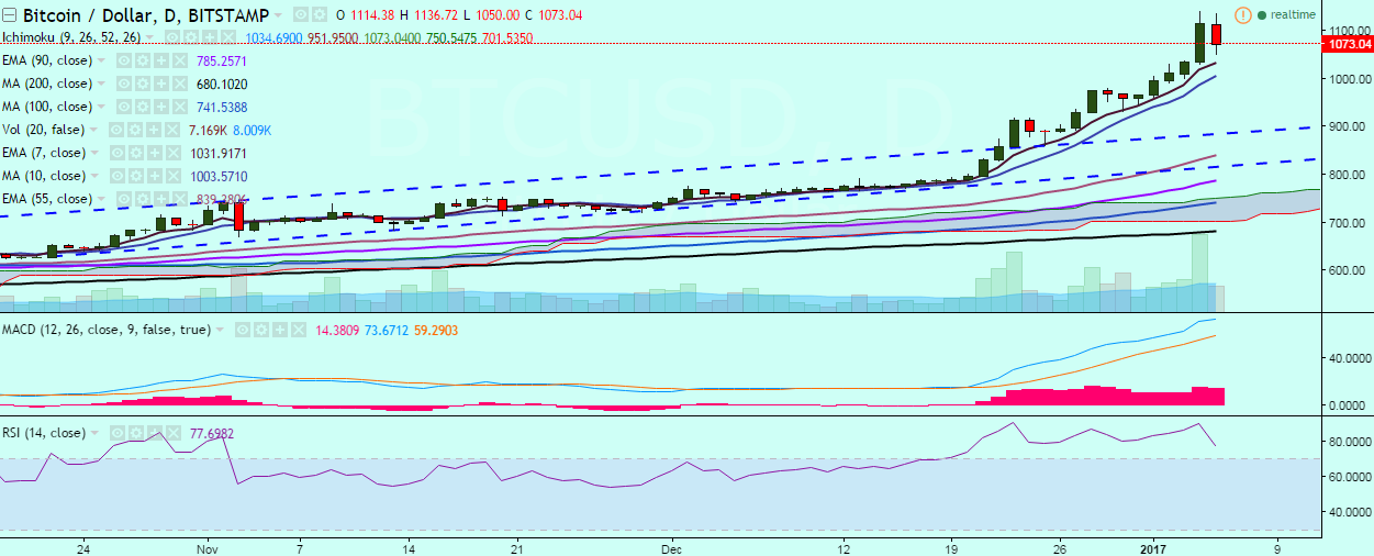 BTC/USD hit a fresh high of 1,139 levels on Wednesday before closing at 1,114 levels. The pair failed to hold its strength and is currently trading in the red at 1,071 levels at press time (Bitstamp).
