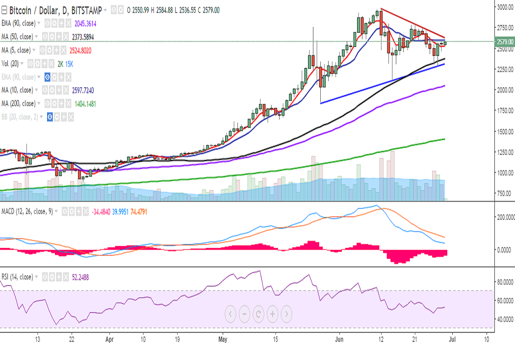 BTC/USD is trading in a narrow range on Thursday as it tries to hold above 5-DMA. It is currently trading at 2574 levels at the time of writing (Bitstamp).