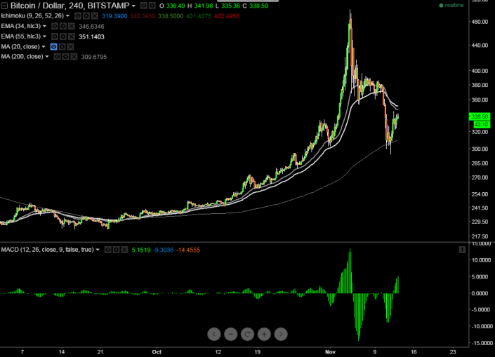 BTC/USD has recovered till $344 after making a low of $2394. It is currently trading around $337. Short term trend is still bearish as long as resistance $370 holds.
