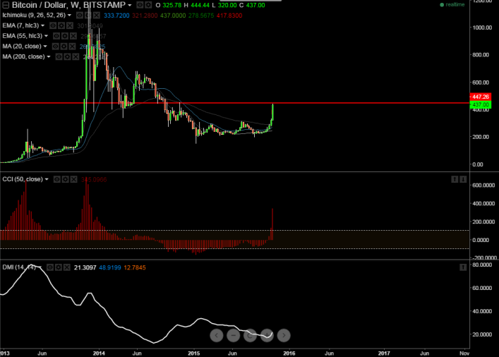 BTC/USD has broken major psychological resistance $400) and jumped till $443 at the time of writing. It is currently trading at $ has declined till $402 in the morning and recovered from that level.