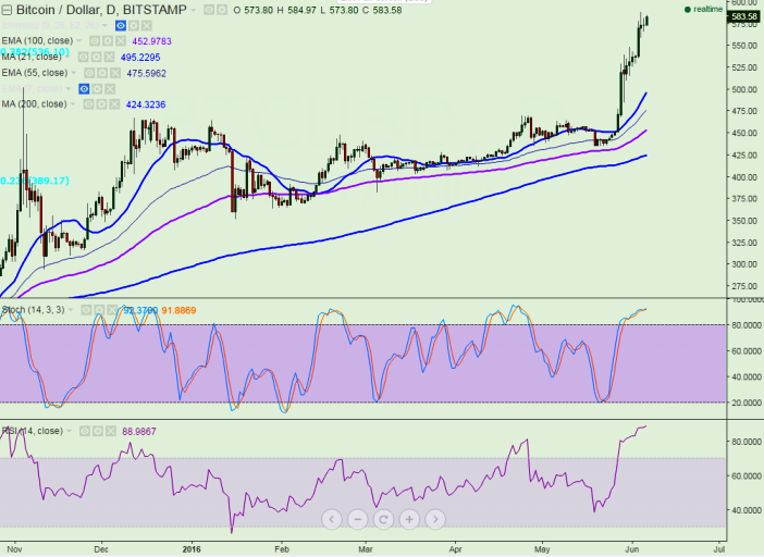 - The pair is facing psychological resistance around $600 and the break will take the pair till $630 (161.8% retracement of $502 and $294)/654/$773 in the short term.