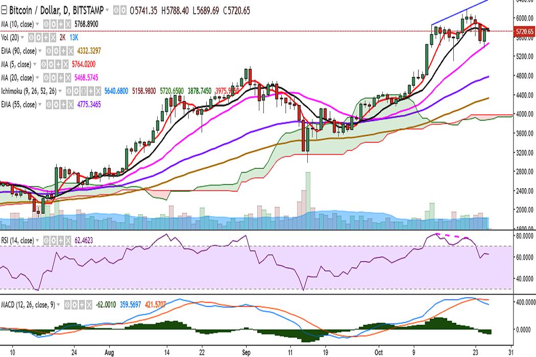 BTC/USD is trading in a close range on Thursday after it closed above 5700 levels on October 25. It is currently trading at 5739 levels at the time of writing (Bitstamp).
