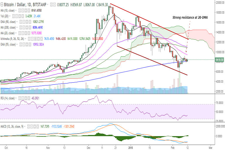 BTC/USD is trading in a close range on Monday as it tries to hold above 200-DMA. It is currently trading at 8435 levels at the time of writing (Bitstamp).