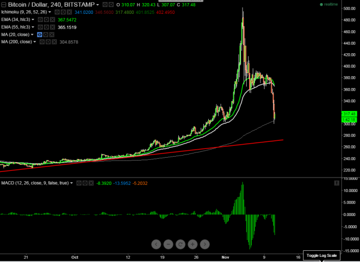 BTC/USD has made a low of $300 today at the writing and is currently trading around $314. Short term trend is still bearish as long as resistance $370 holds.