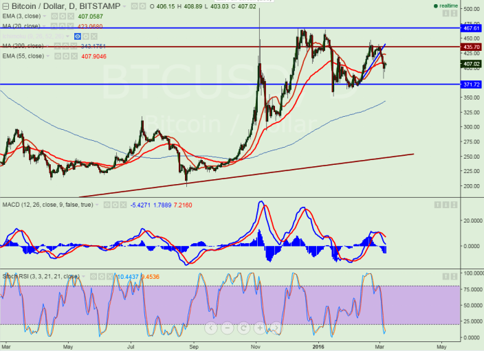- BTC/USD has recovered after making a low of $382. It is trading around $408.