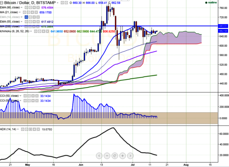 BTC/USD is consolidating in a narrow range between $678 and $650 for the past three trading session. It is currently trading at $661.55 levels (Bitstamp).