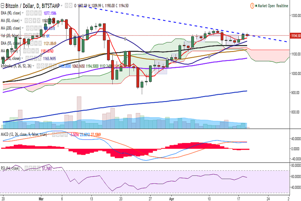 BTC/USD failed to close above trend line resistance on Tuesday. It is currently trading at 1190 levels at the time of writing (Bitstamp).