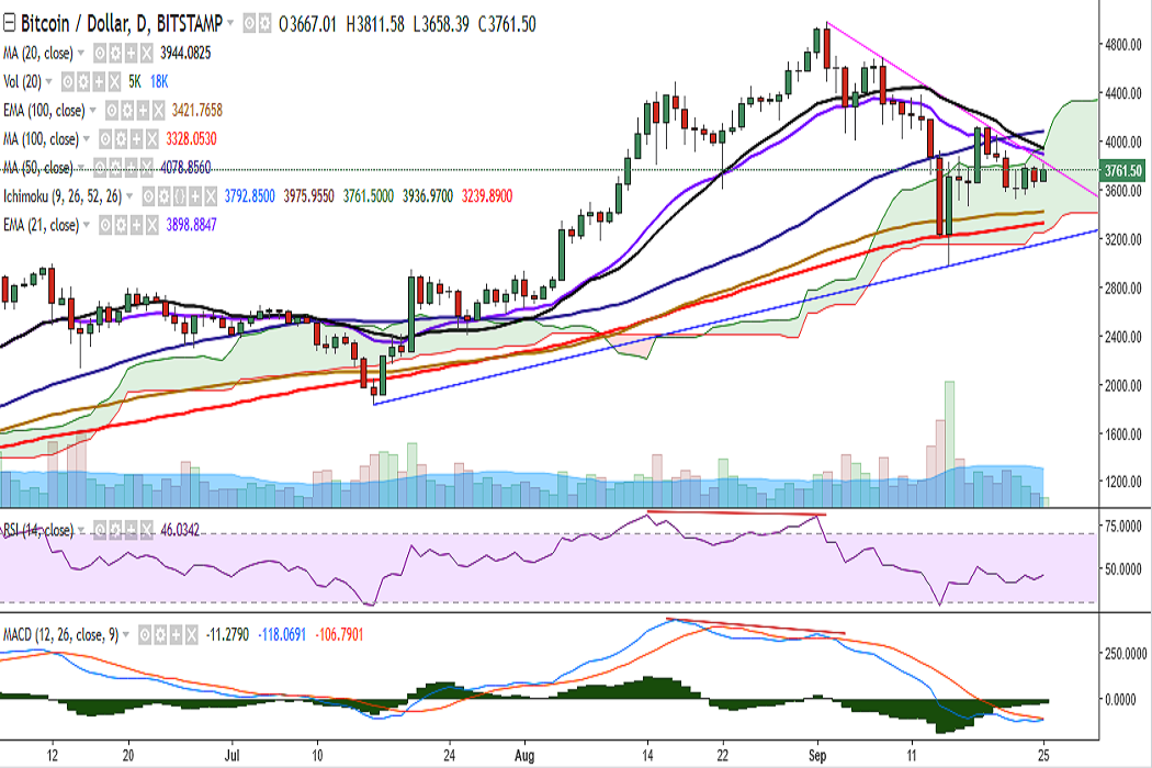 BTC/USD is consolidating inside Ichimoku Cloud on Monday as it faces strong trend line resistance at 3827 levels. It is currently trading at 3756 levels at the time of writing (Bitstamp).