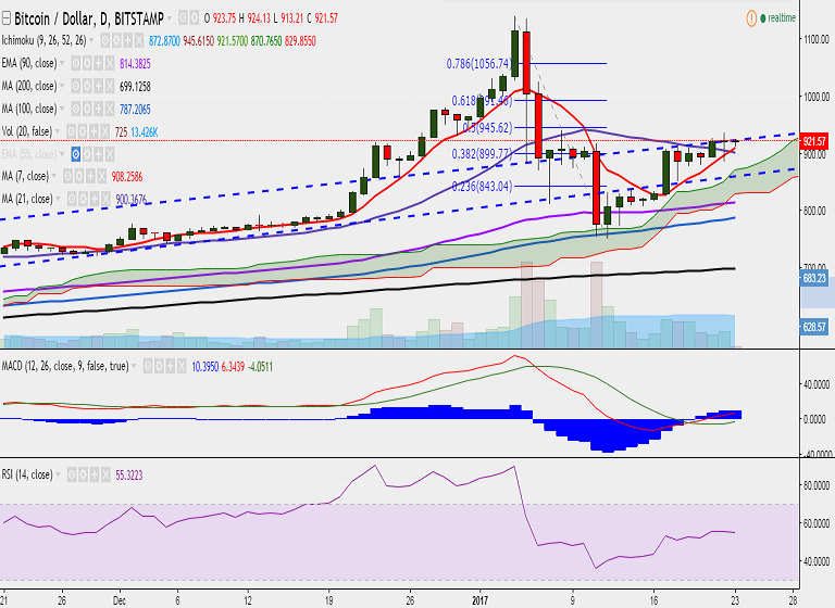 BTC/USD is struggling for a consistent break above the trend line resistance and is currently trading at 922 levels (Bitstamp).